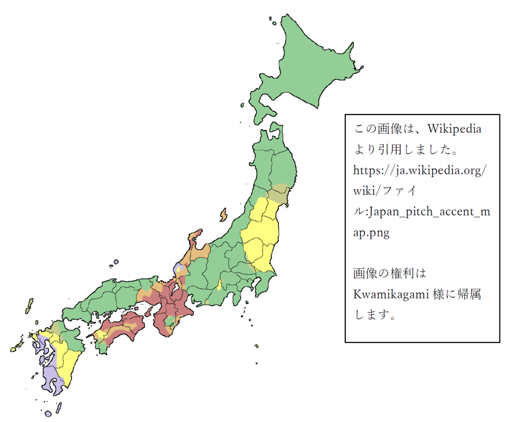 今日は方言の中でもイントネーションの話をしたいと思います。皆さんは「箸と橋」「雨と飴」など、どのように言い分けていますか? 地域によって違いますが、それらを色分けしたのが上の地図です。