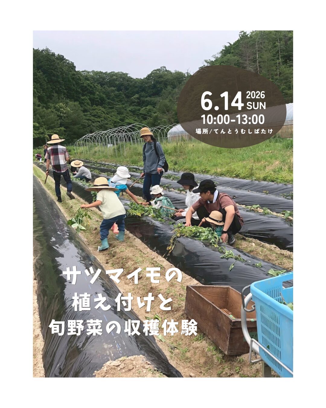 10:00集合>畑へ移動>さつまいもの植え付け>旬野菜の収穫体験>畑で昼食>解散