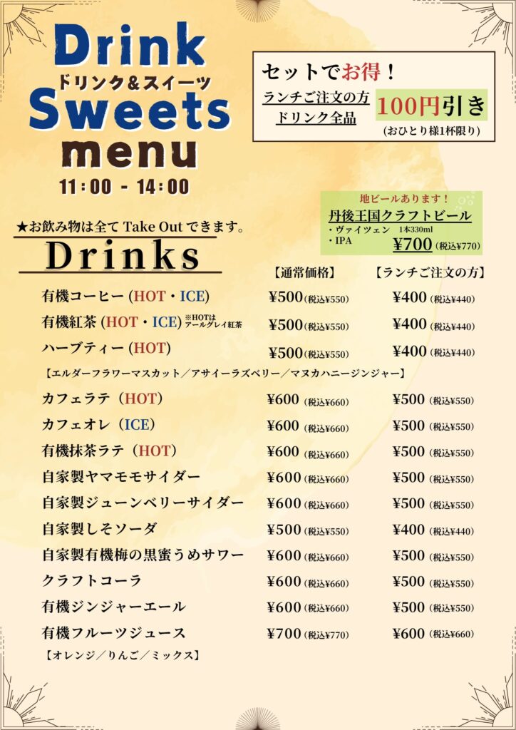2025年4月より、店内ご飲食において、消費税導入による価格改定をさせていただくこととなりました。お客様にはご不便をおかけいたしますが、ご理解くださいますようよろしくお願いいたします。